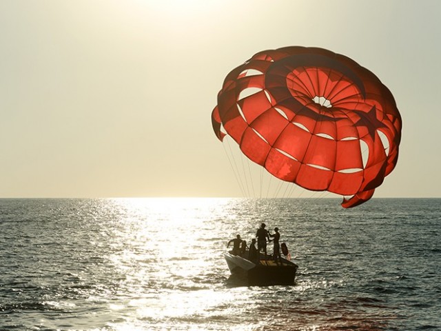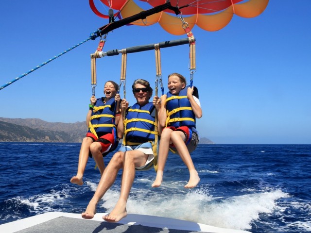 One parachute, two people and lots of fun. With the added option of choosing between landing back on the earth or taking a dip in the ocean at the end of your descent. Parasailing can be done tandem or by yourself. The crew availabe to assist you will give all the instructions and safety rules needed to know as preperation for the flight. You´ll progressively ascend up to about 900ft. This parasailing activity is the way to go if you want to have a great time with family and friends on water.